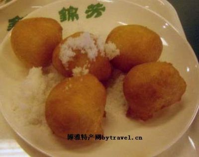 将水放入锅内烧开,放入少许白矾熬至融化,投入面粉搅拌均匀,成为软面团,包入陷(一般是红豆陷)七成热油中炸,炸至浮起,呈金黄色,皮酥即成。