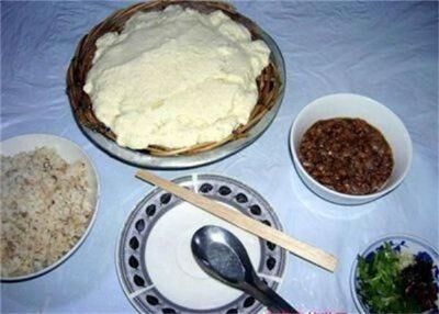 状如豆腐脑。色洁白、晶莹光亮,近似透明。吃时盛于柳条儿去皮儿后编成的形状近似船型的小浅儿内,小浅儿座于盆儿上,去浆。观之赏心悦目;闻之醇香扑鼻;入口爽滑细腻。连同红辣椒、鲜香菜、小葱儿相搭配,放盐、味精、香油等做成的辅料一同食用,饱而不腻,令人回味悠长。