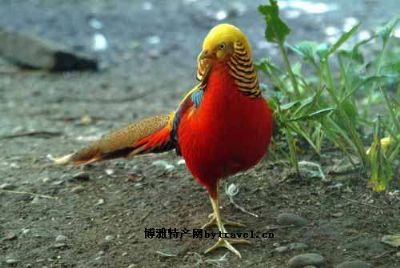 红腹锦鸡之所以为山鸟中的佼佼者,是因为它的色彩十分迷人。红腹锦鸡又称"金鸡"、"锦鸡",体小尾长,风韵袭人。头部呈金黄色丝状羽冠散覆颈上。后颈围生金棕色扇状羽毛,形若披肩。背上有一浓绿透黑的斑点,至腰为金黄色。尾长约1米,羽毛呈黑褐和桂黄之间,黄中透黑,墨里乏金,楚楚艳丽。腹部一抹深红,格外迷人。正因为红腹锦鸡羽毛色彩奇艳,所以常常被用来观赏,皮张是美丽的装饰品。( 银川)